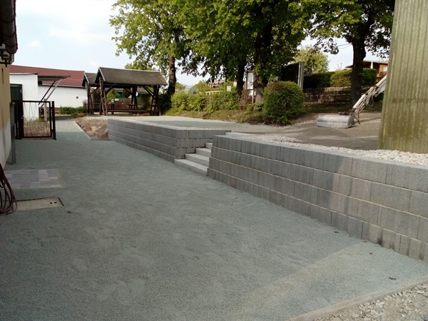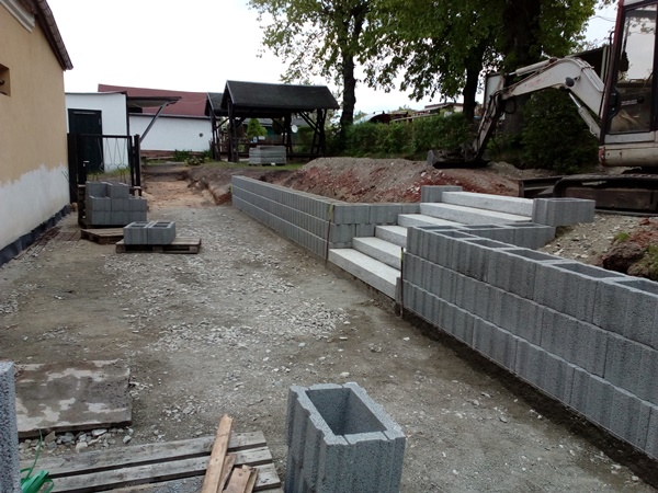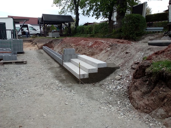 Nach dem die Treppe gesetzt war hatte man schon eine Vorstellung wie alles mal aussehen könnte. Pflanzsteine für die Mauer wurden aufgestellt und verbunden.