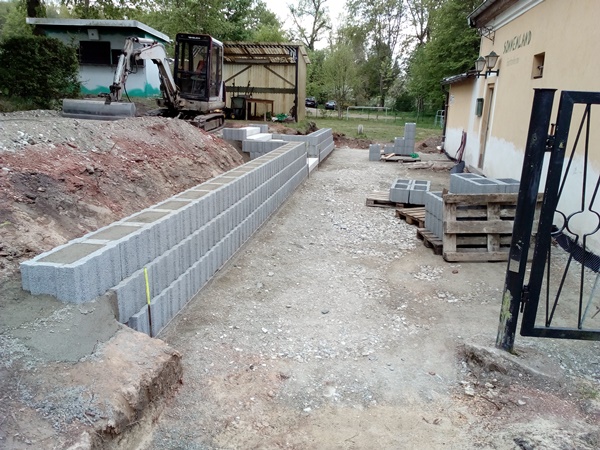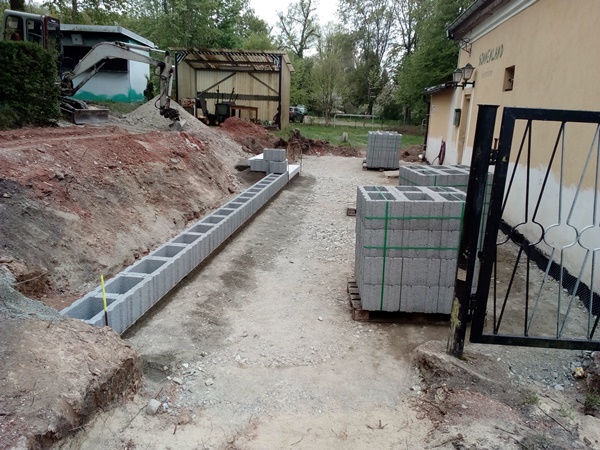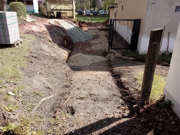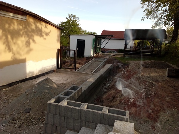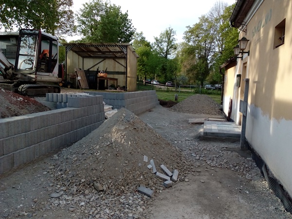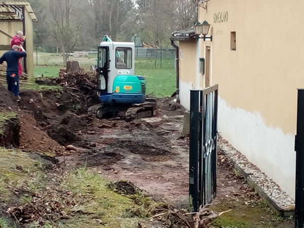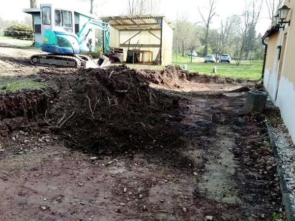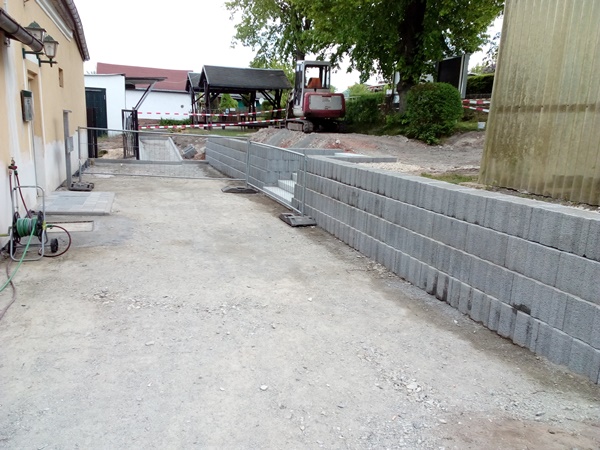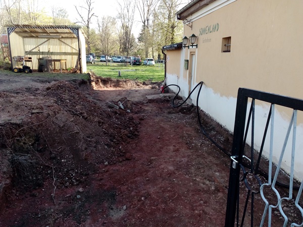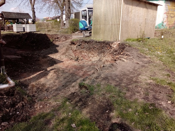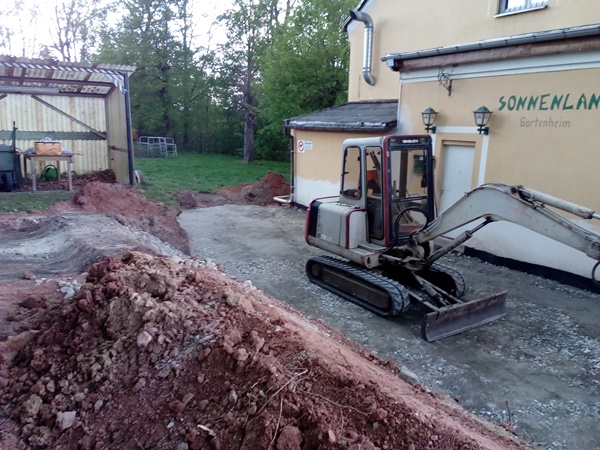 Baubeginn war Ende April 2018. Die Firma richtete die Baustelle ein und begann auch gleich mit der Arbeit. Schwierig gestaltete sich die Entfernung einer Wurzel, bei der wir nicht wussten wie diese Verwurzelt ist. Auch haben wir in der Nähe einen Unterstand der Unmittelbar betroffen war. Aber es ging alles gut.