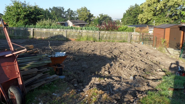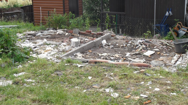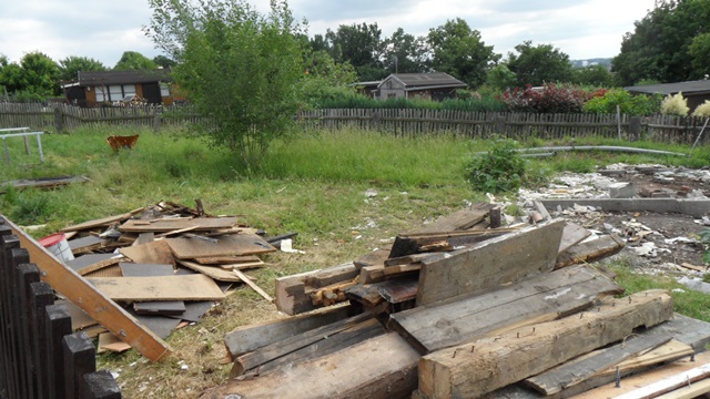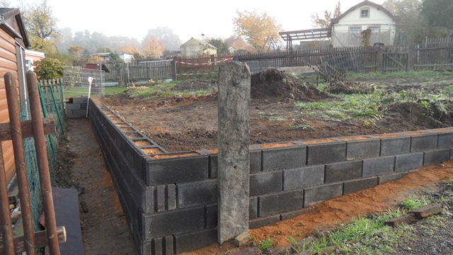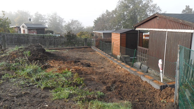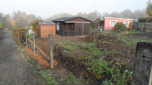 Nach der Entkernung 2015 haben wir begonnen, eine Stützmauer zur Nachbarparzelle zu errichten. Die nächste Maßnahme ist es, einen kleinen Schuppen aufzustellen, um Kleinwerkzeuge unterzubringen.