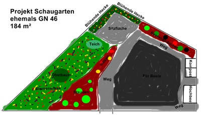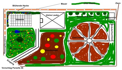 Auf einer Fläche von 185 m² sollen verschiedene Anbauflächen entstehen. Wie zum Beispiel eine kleine Sitzecke, Beerenstäuchen, Blumenstaden uns Rosen sowie ein Gemüsebeet. Auch ein Obstbaum und ein kleiner Teich sollen die Parzelle bereichern.